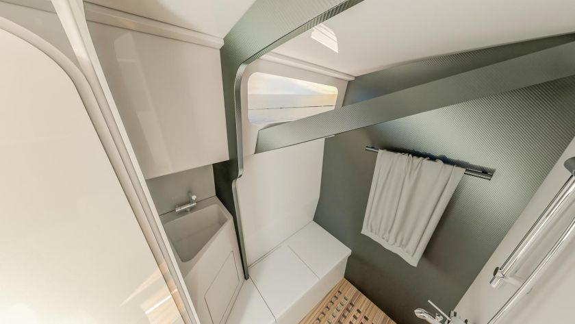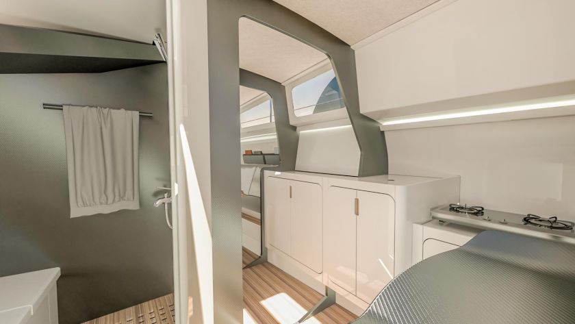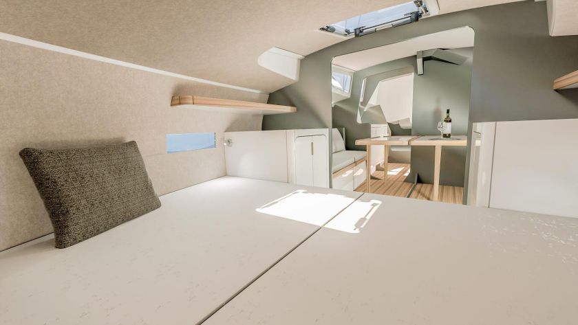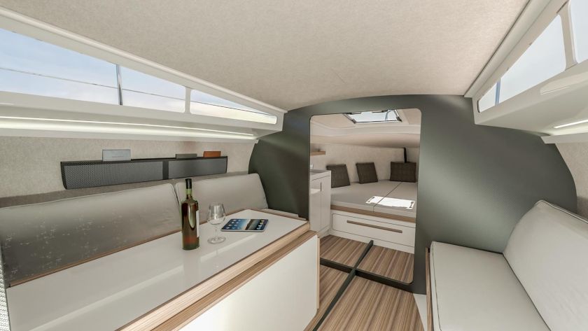 Sleeping for 5: A well-thought-out, sporty interior featuring a shower, toilet, and compact galley – perfect for performance-minded sailing families or regatta crews who value comfort after a day at full speed.